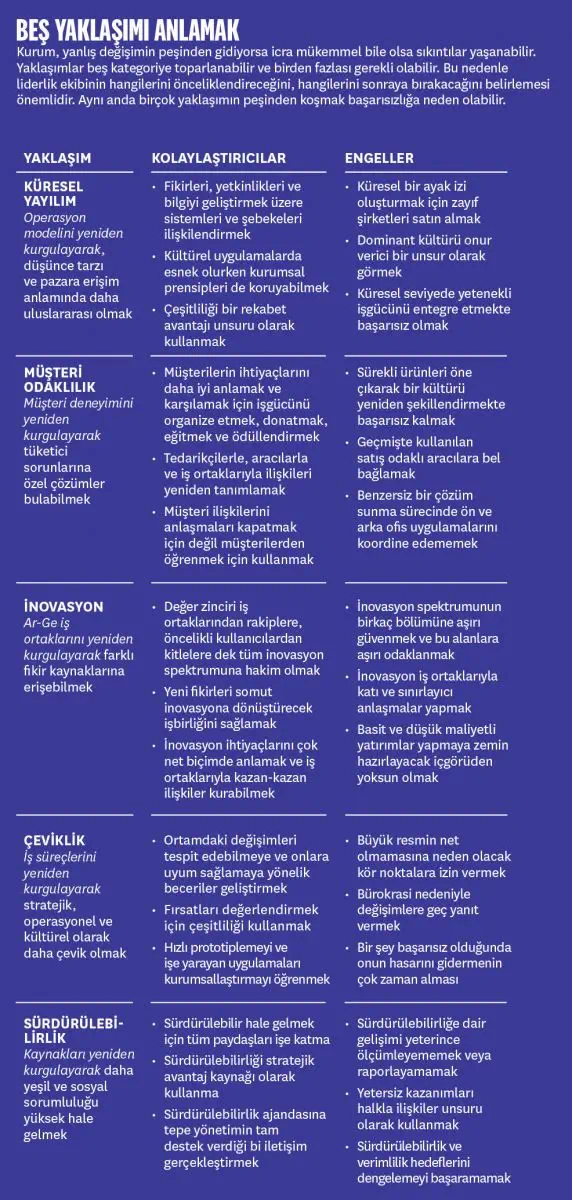 Yaptığımız analizler ve araştırmalara göre birçok kurumsal dönüşüm çabaları şu beş yaklaşımın türevidir: