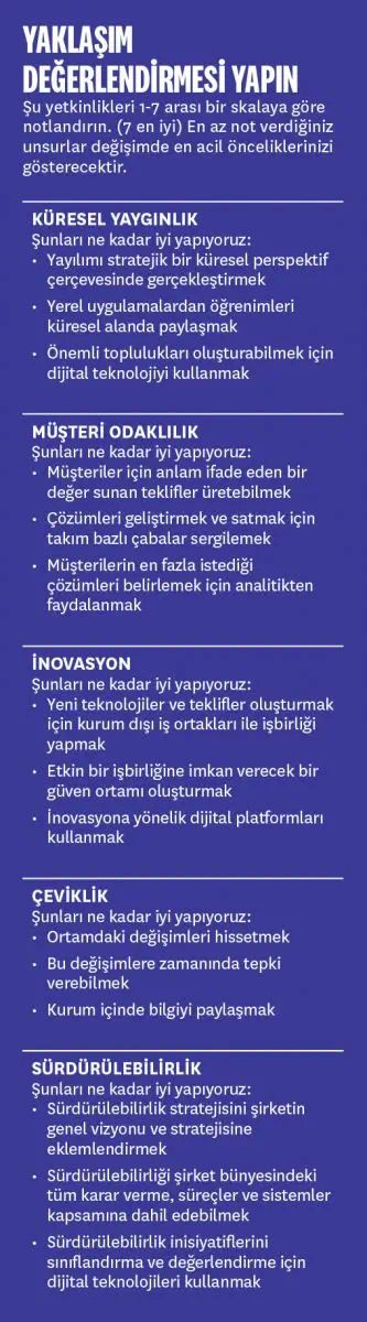 Odaklanılması gereken birden fazla kurumsal nokta söz konusu olduğunda tepe yöneticiler hangi önceliğin seçilmesi gerektiği konusunda fikir ayrılığı yaşayabilir. Bunu önlemek için 15 soruluk bir değerlendirme hazırladık. (“Yaklaşım Değerlendirmesi” kutusuna bakınız.) Araştırmalarımızda ve danışmanlık faaliyetlerimizde gördük ki bu araç, yöneticilerin kendi sistematik değerlendirmelerini yapmalarına ve böylelikle dönüşüme dair daha doğru kararlar vermelerine yardımcı olabiliyor. Örneğin birlikte çalıştığımız bir Fransız şirketinde 200 tepe yönetici “dönüşüm oturumuna” katıldı ve her bir potansiyel yaklaşıma dair kolaylaştırıcı ve engelleyici unsurları belirttikleri bir değerlendirme formu doldurdular. Bu ve yaklaşım değerlendirmesi tepe yönetimden saha ekiplerine kurumun farklı noktalarındaki önceliklerin ve fikirlerin önem sırasına koyulmasına yardımcı oldu.